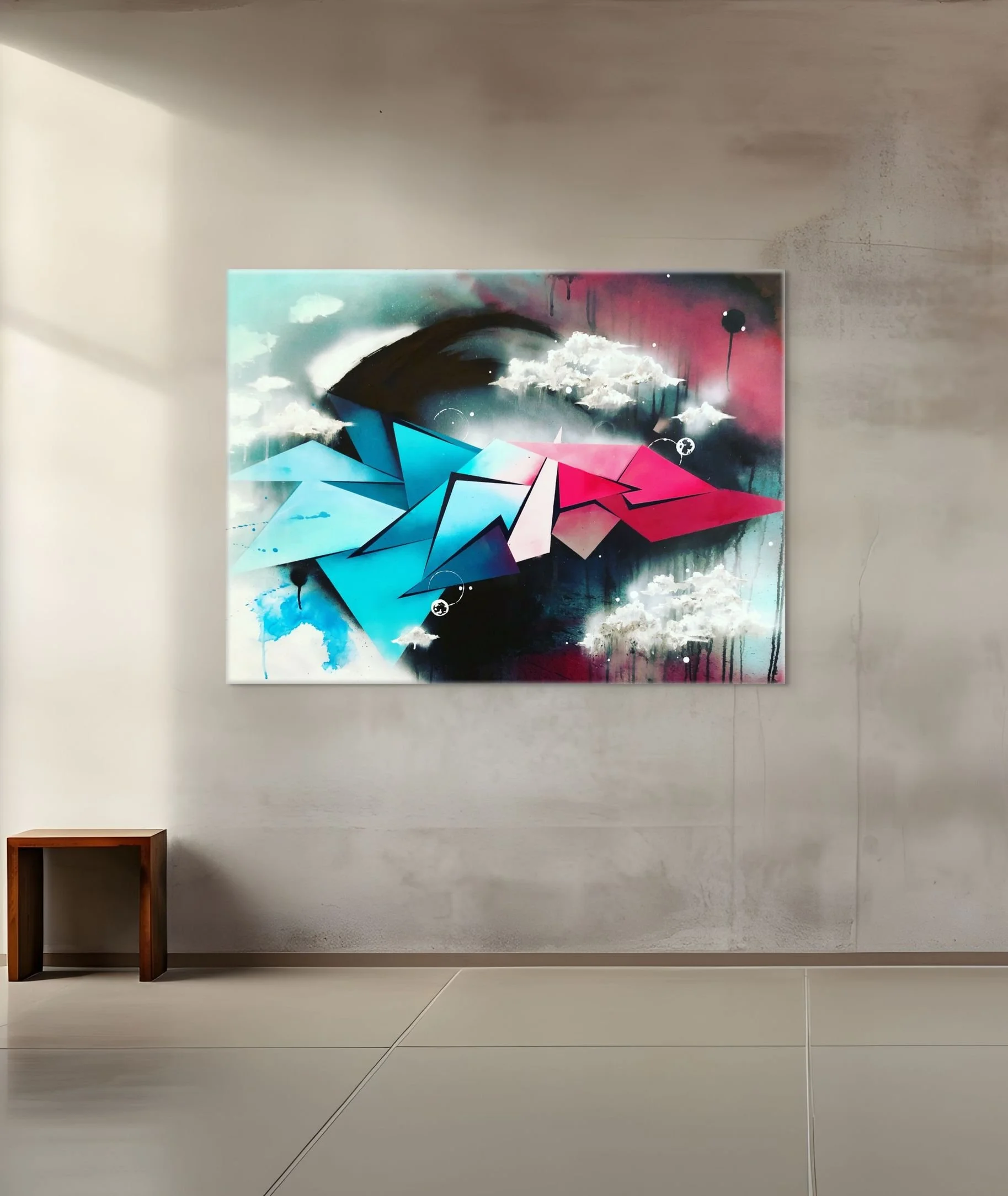 Flight was a commissioned piece that I sold. It started as a digital sketch with a very different color scheme and was adapted to change the vibe. The triangles give this piece directionality as if it’s soaring towards something.