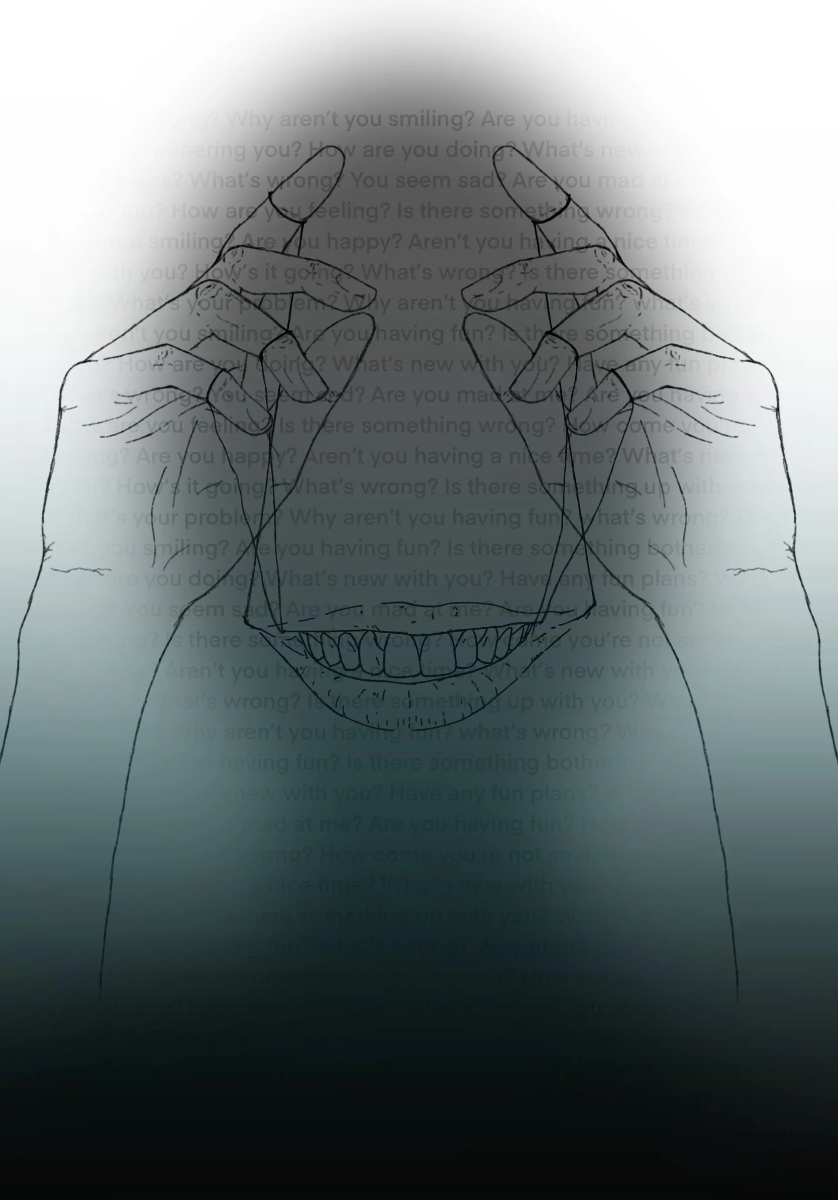 The piece reflects the tension between visibility and vulnerability. The forced smile becomes a barrier, protecting the inner self while simultaneously trapping it. Anxiety gives form to the quiet panic of being seen too much and not enough at the same time.