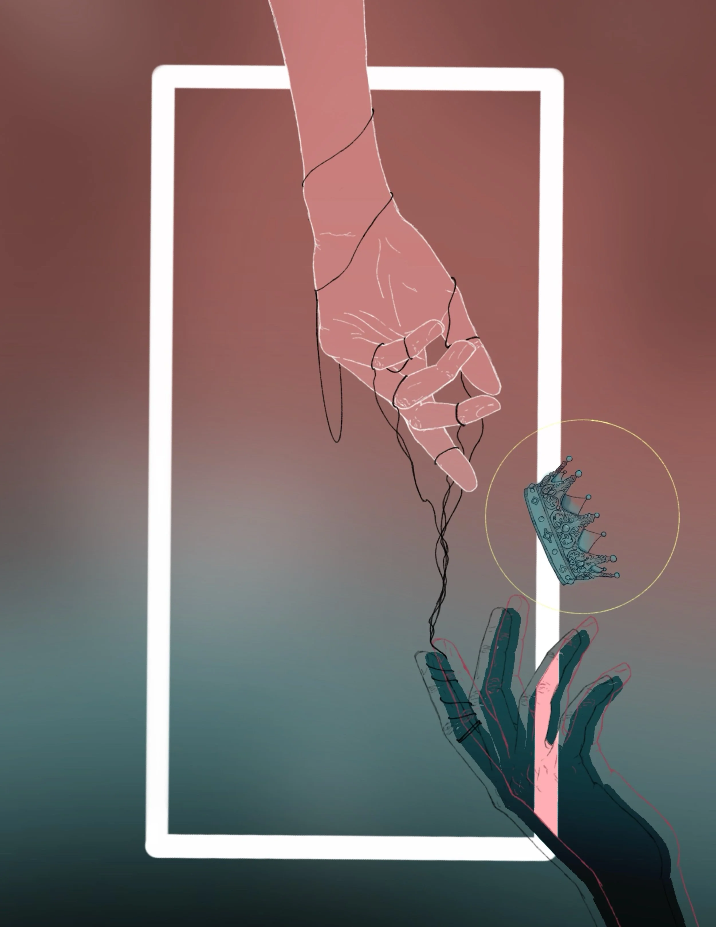 Below, a darker hand waits to receive it. Thin strings wind from its fingers upward, subtly tethering the lighter hand above. This connection exposes the imbalance of power: what appears to be a choice is instead a guided motion. The darker hand’s doubled outlines and misaligned colors distort its form, suggesting deception—the Void presenting itself as something familiar, even helpful, while quietly exerting control.